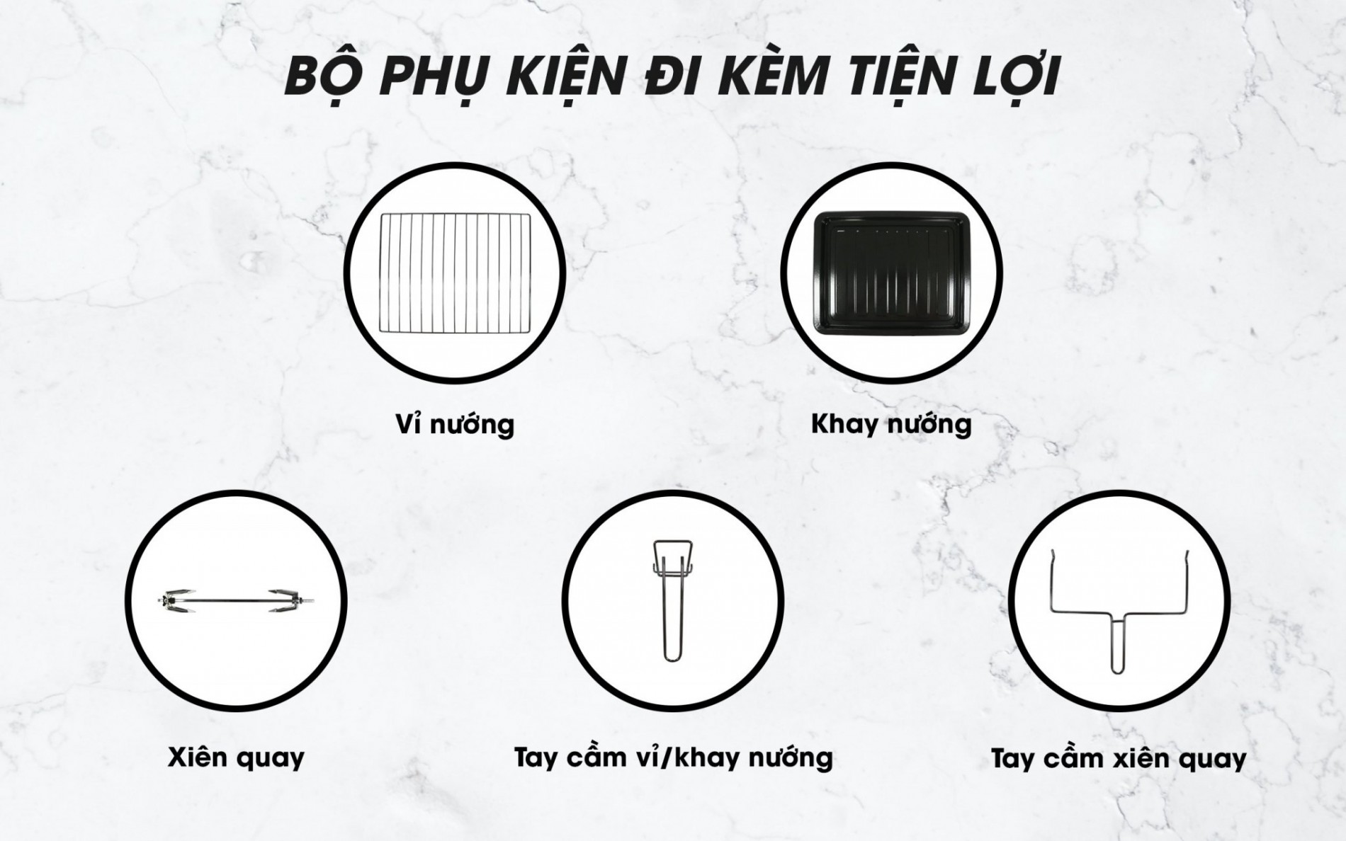 Lò nướng có các phụ kiện đi kèm như thanh xiên inox giúp cố định các thực phẩm giúp nướng chín đều, mà không bị cháy. Sản phẩm có thêm khay hứng mỡ, khay inox để có thể phục vụ để chế biến các món ăn cũng như vệ sinh sau khi chế biến.