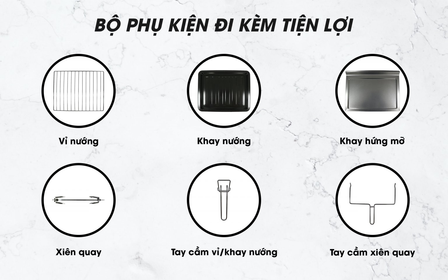 Lò nướng có các phụ kiện đi kèm như thanh xiên inox giúp cố định các thực phẩm giúp nướng chín đều, mà không bị cháy. Sản phẩm có thêm khay hứng mỡ, khay inox để có thể phục vụ để chế biến các món ăn cũng như vệ sinh sau khi chế biến.