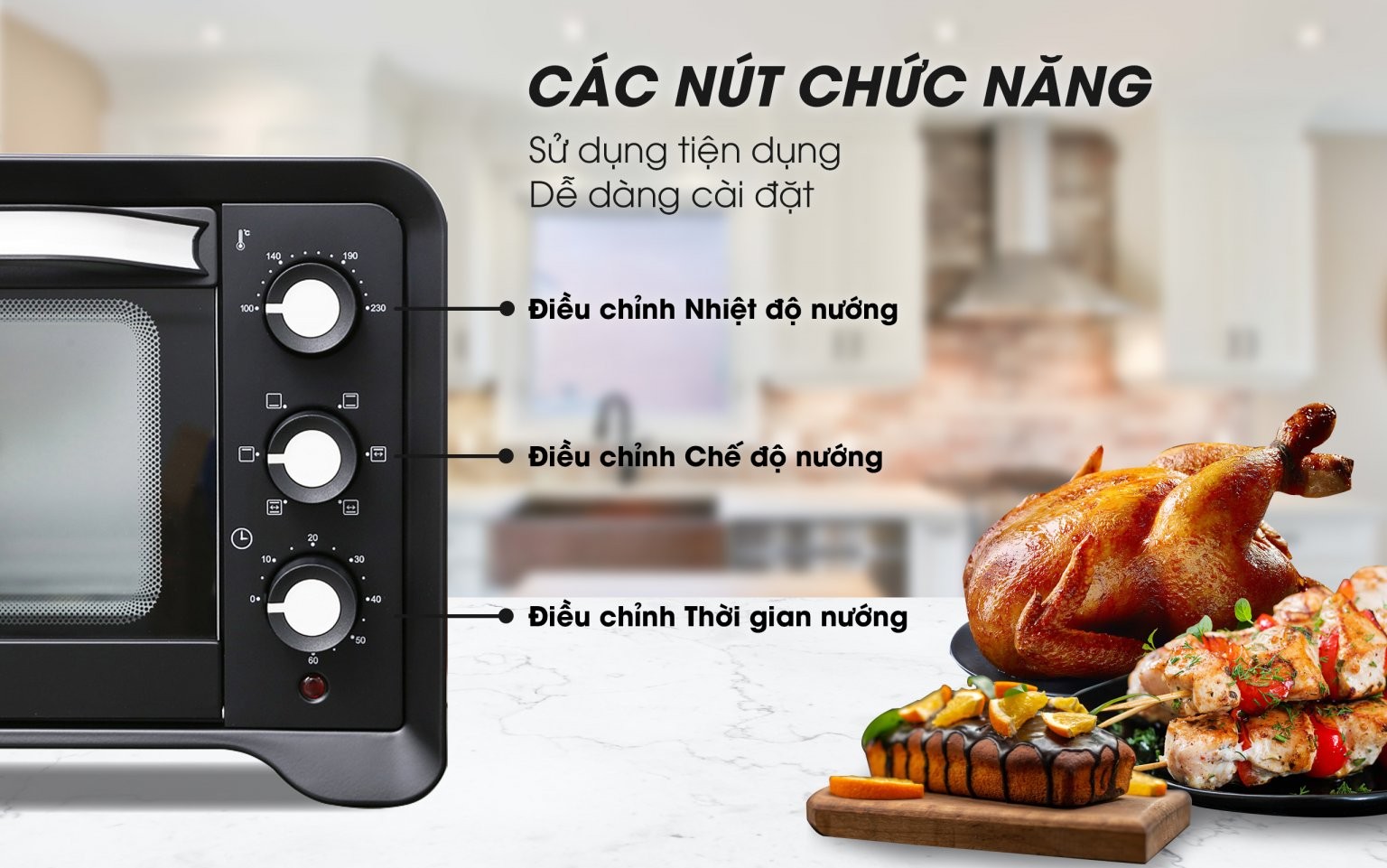 Sản phẩm có 3 núm xoay dễ dàng điều chỉnh, sử dụng, bạn có thể dễ dàng tùy chỉnh thời gian cũng như nhiệt độ sao cho phù hợp với từng món ăn.