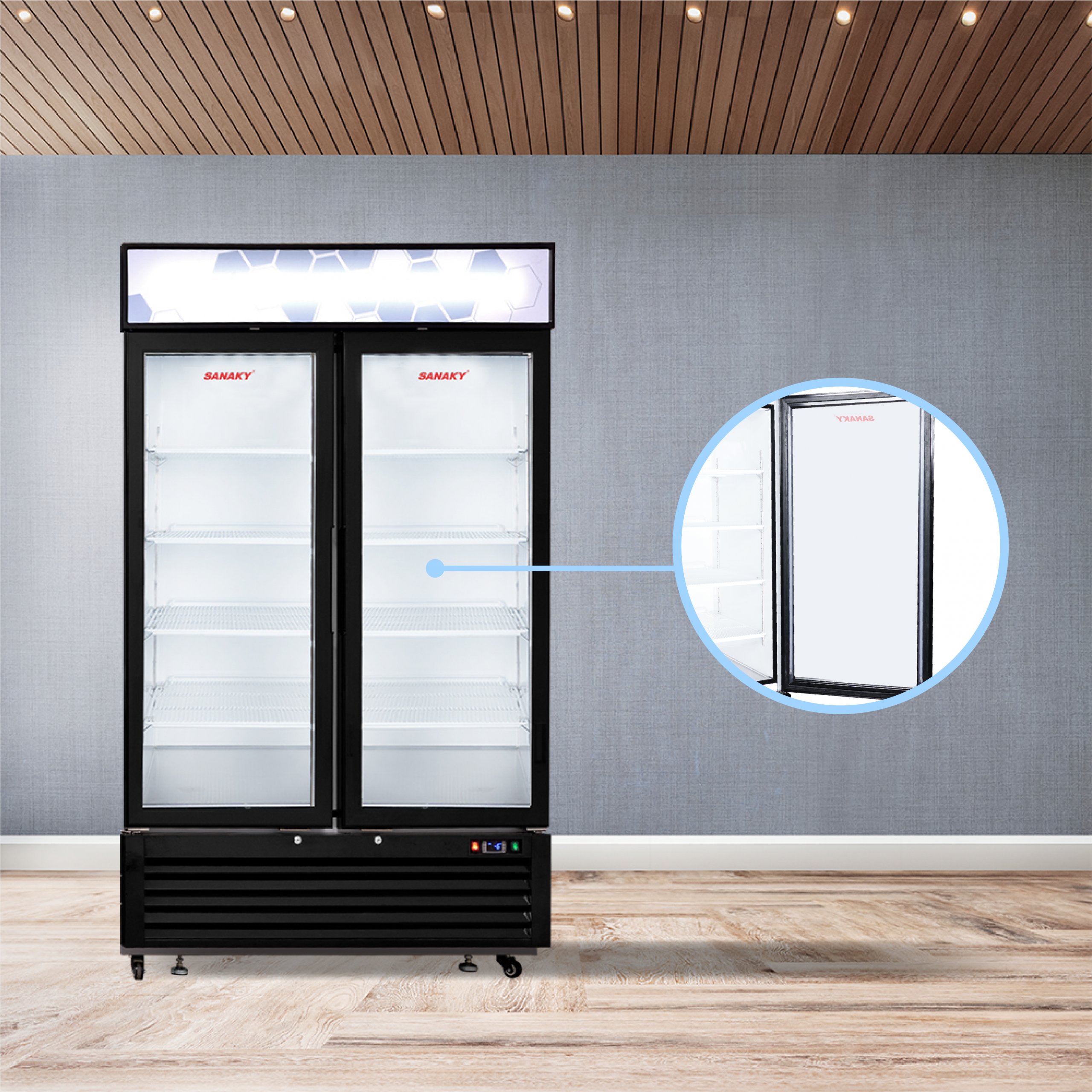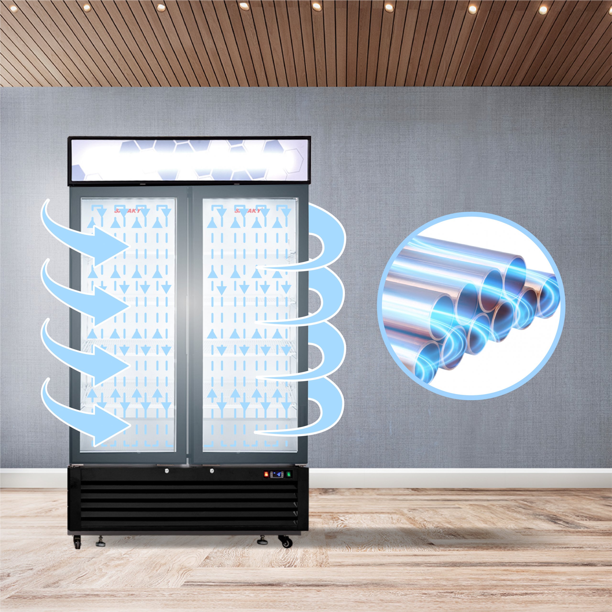 Kính của tủ là loại mặt kính 3 lớp hút chân không kết hợp sử dụng công nghệ sấy kính điện trở âm giúp cho mặt kính luôn được khô ráo, không đọng sương, phù hợp cho việc quan sát thực phẩm trưng bày trong tủ.