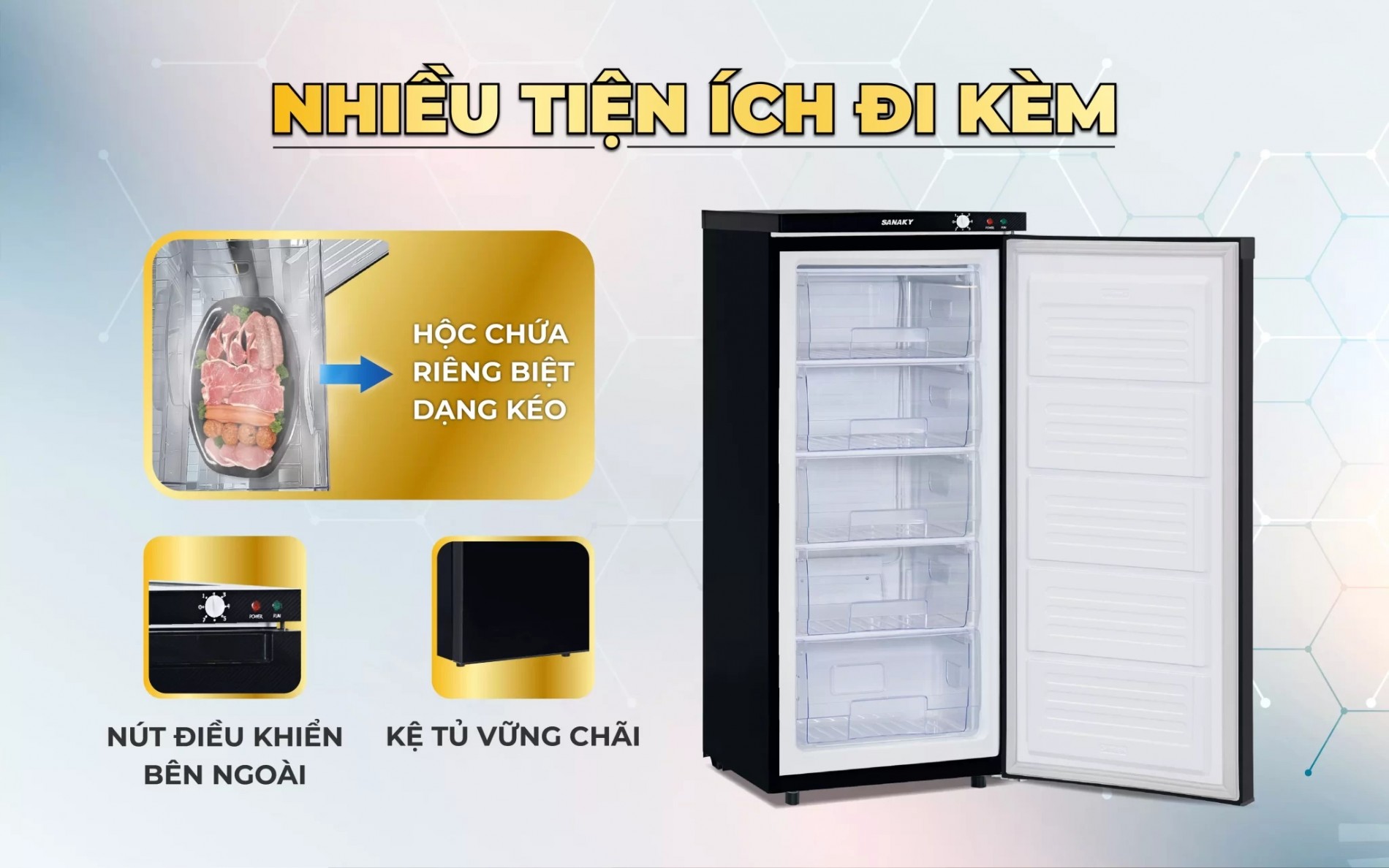 Tủ đông thiết kế với 5 hộc chứa dễ dàng cho việc vệ sinh và sắp xếp thực phẩm, hạn chế thoát nhiệt và tiết kiệm điện năng. Đặc biệt hơn, với sản phẩm tủ đông này, các hộc chứa được thiết kế theo dạng ngăn kéo, rất tiện lợi với việc phân loại thực phẩm.