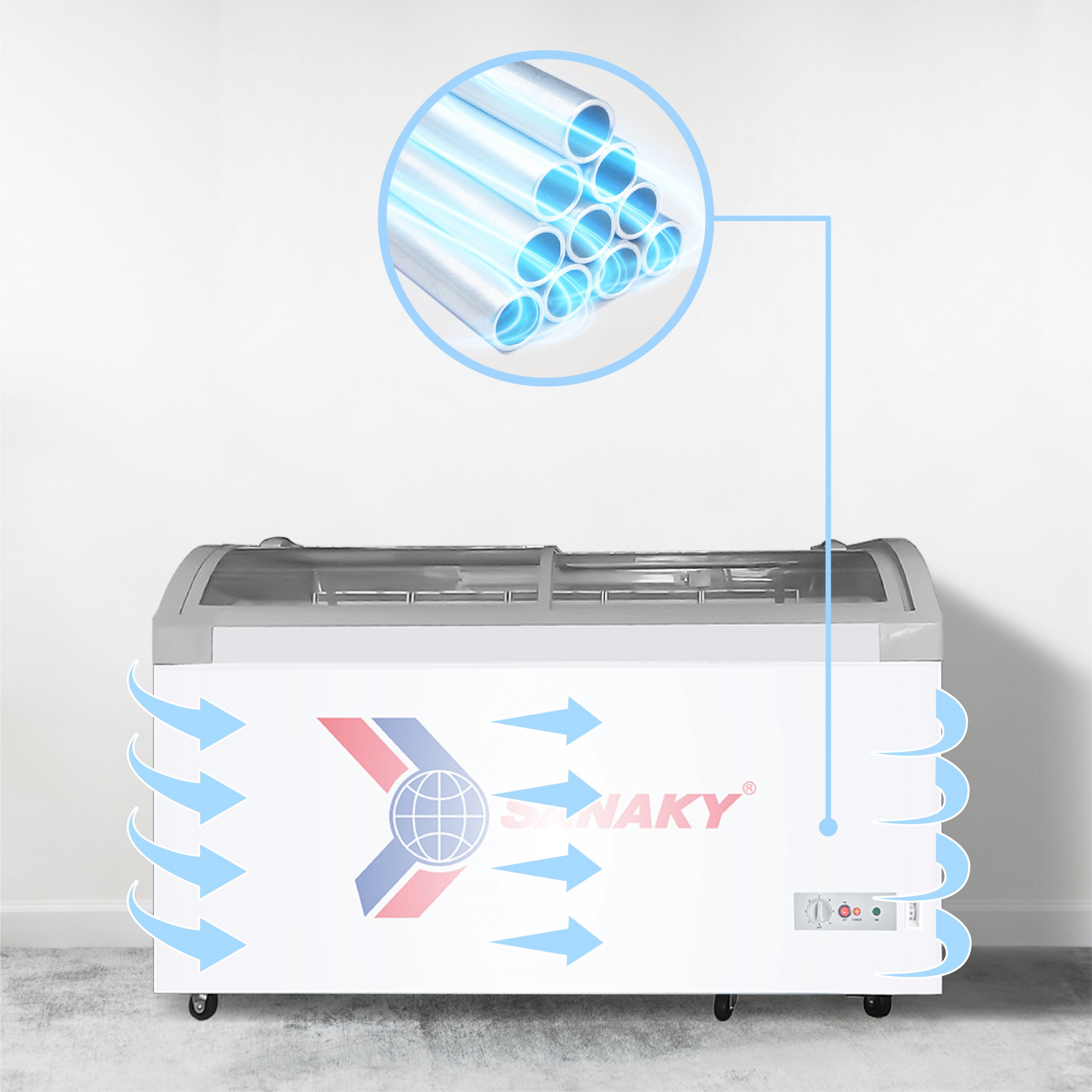 Sản phẩm được ứng dụng công nghệ làm lạnh 360 độ, hơi lạnh sẽ được tỏa đều bên trong tủ, tác động toàn diện lên bề mặt thực phẩm, đem đến hiệu quả làm lạnh sâu, đóng đông triệt để.