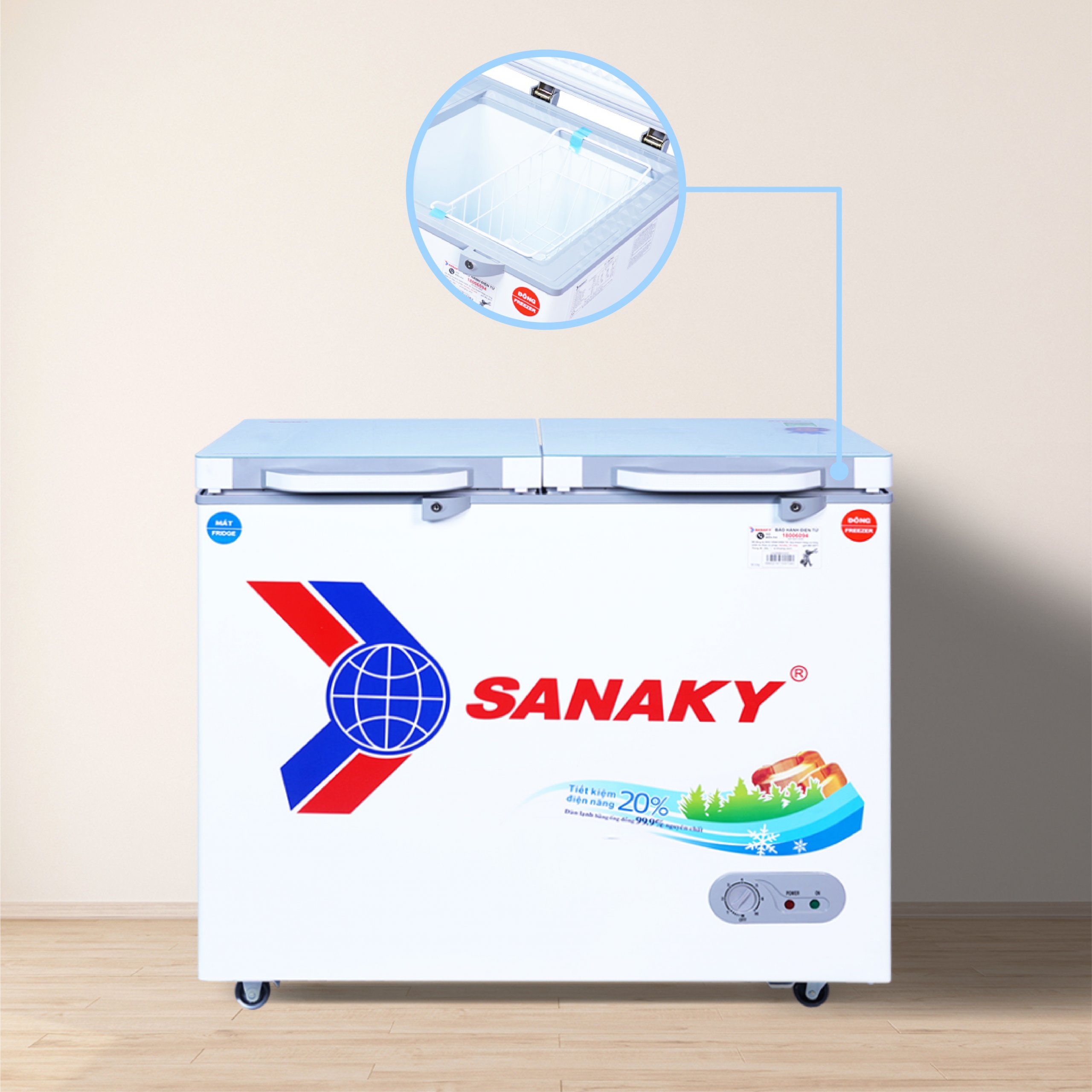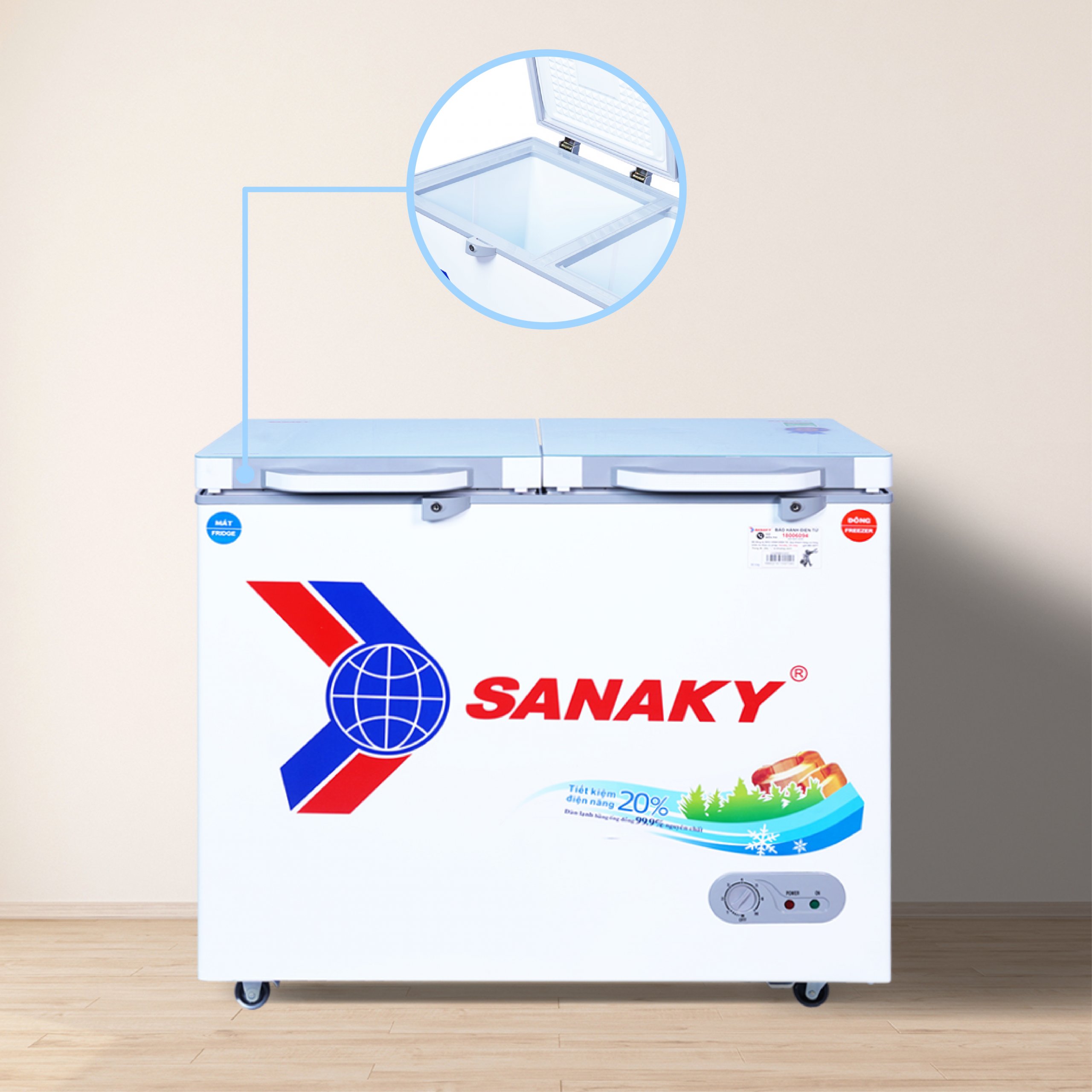 Tủ có được chia làm 2 ngăn: ngăn đông và ngăn mát riêng biệt, có dán nhãn chỉ dẫn tiện quan sát, tủ đông Sanaky cho phép bạn dễ dàng phân loại thực phẩm để bảo quản.