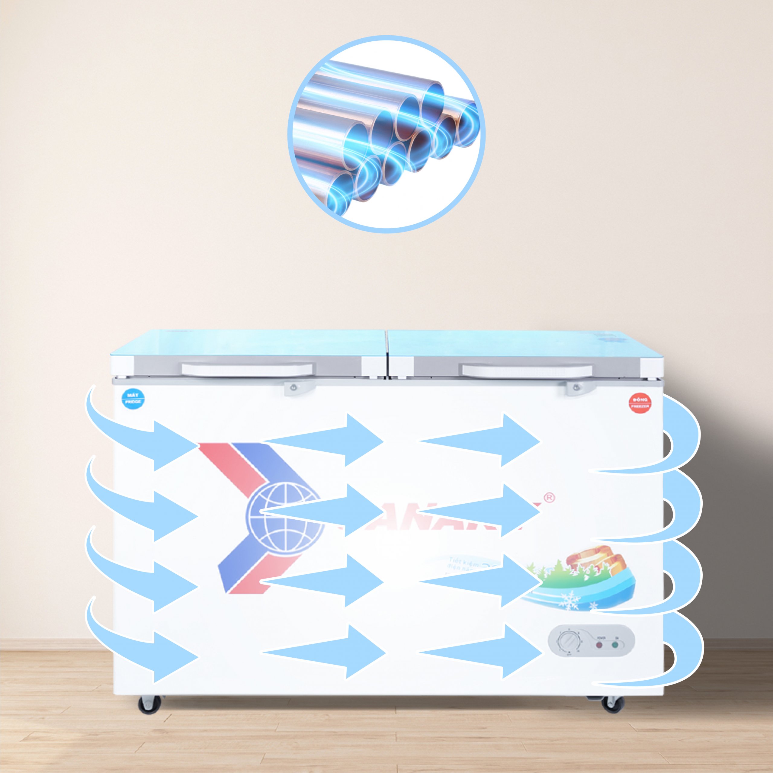 Sản phẩm được ứng dụng công nghệ làm lạnh 360 độ, hơi lạnh sẽ được tỏa đều bên trong tủ, tác động toàn diện lên bề mặt thực phẩm, đem đến hiệu quả làm lạnh sâu, đóng đông triệt để.