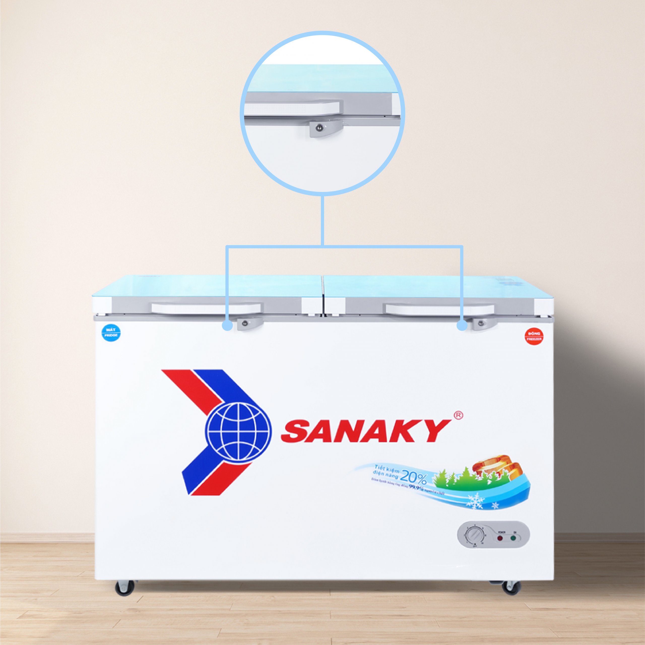 Tủ có được chia làm 2 ngăn: ngăn đông và ngăn mát riêng biệt, có dán nhãn chỉ dẫn tiện quan sát, tủ đông Sanaky cho phép bạn dễ dàng phân loại thực phẩm để bảo quản.