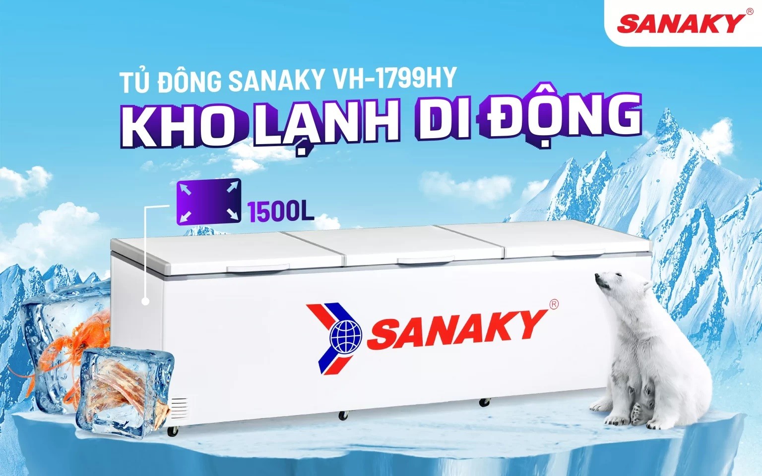 Tủ đông Sanaky VH-1799HY là loại tủ đông công nghiệp lớn, một sản phẩm mới của Sanaky. Tủ có các chức năng giống với các dòng tủ đông 1 ngăn Sanaky khác, điểm khác biệt là kích thước lớn, với dung tích thực 1500 lít có thể trữ được một lượng đáng kể thực phẩm. Ngoài ra, tủ còn sử dụng dàn lạnh đồng nguyên chất, giúp cho tủ vận hành êm ái, đồng thời có được độ bền cao.