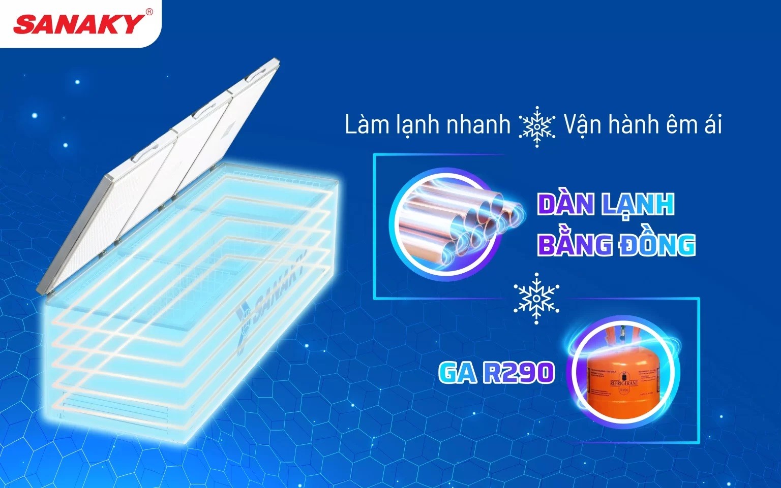 Dàn lạnh đồng nguyên chất và Gas R290 thân thiện môi trường giúp tủ hoạt động ổn định và có độ bền cao.