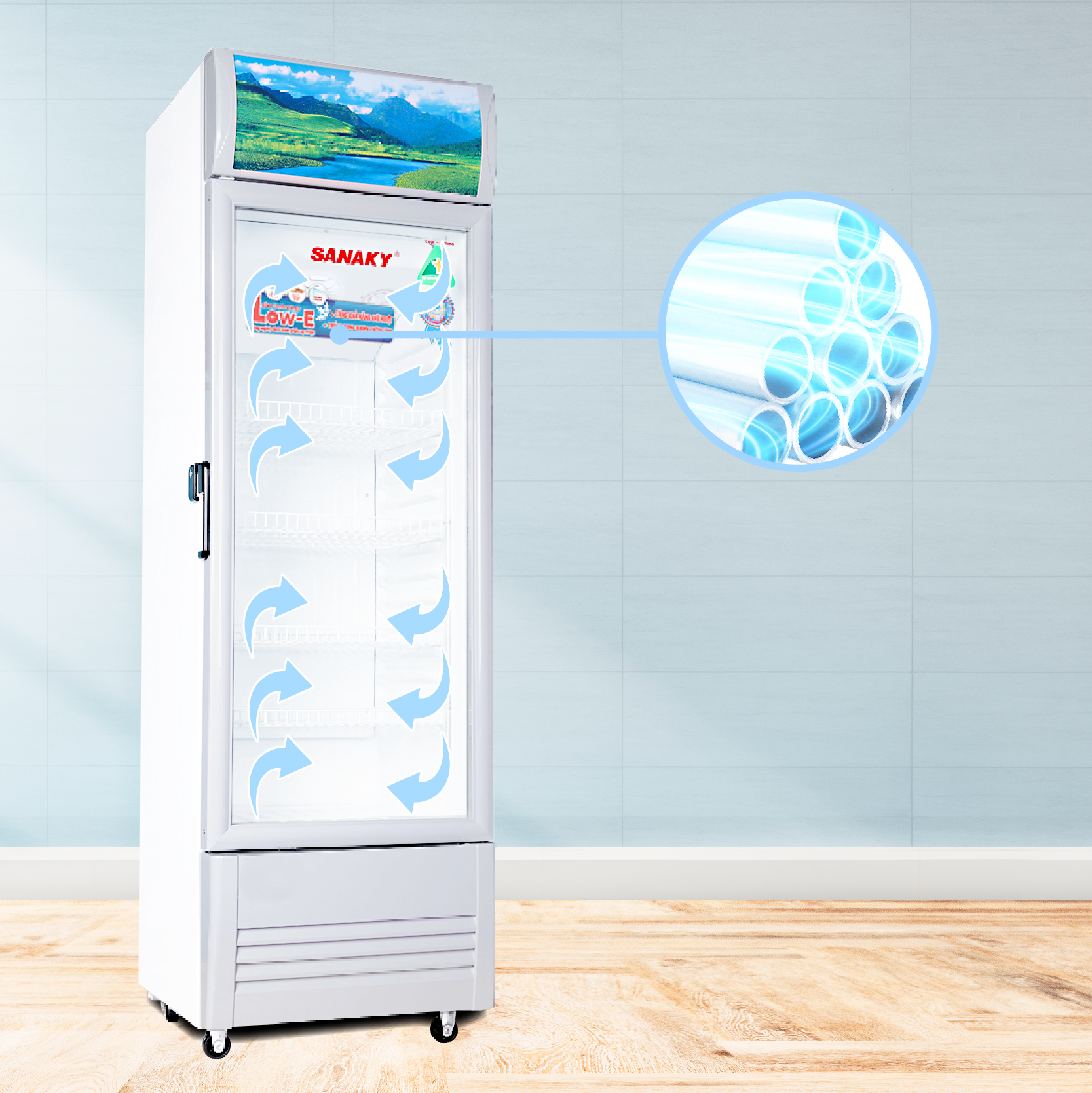 Tủ mát Sanaky được thiết kế với hệ thống đèn LED dọc theo hông và nóc tủ, chiếu sáng toàn bộ các góc khuất giúp trưng bày các sản phẩm bắt mắt và thu hút.