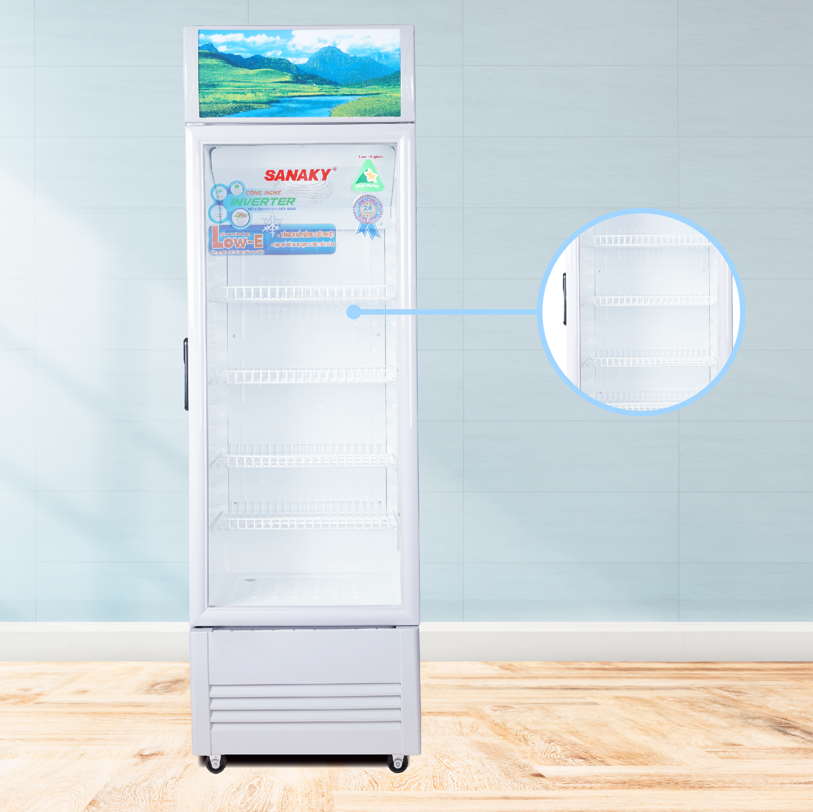 Tủ mát Sanaky được thiết kế với hệ thống đèn LED dọc theo hông và nóc tủ, chiếu sáng toàn bộ các góc khuất giúp trưng bày các sản phẩm bắt mắt và thu hút.