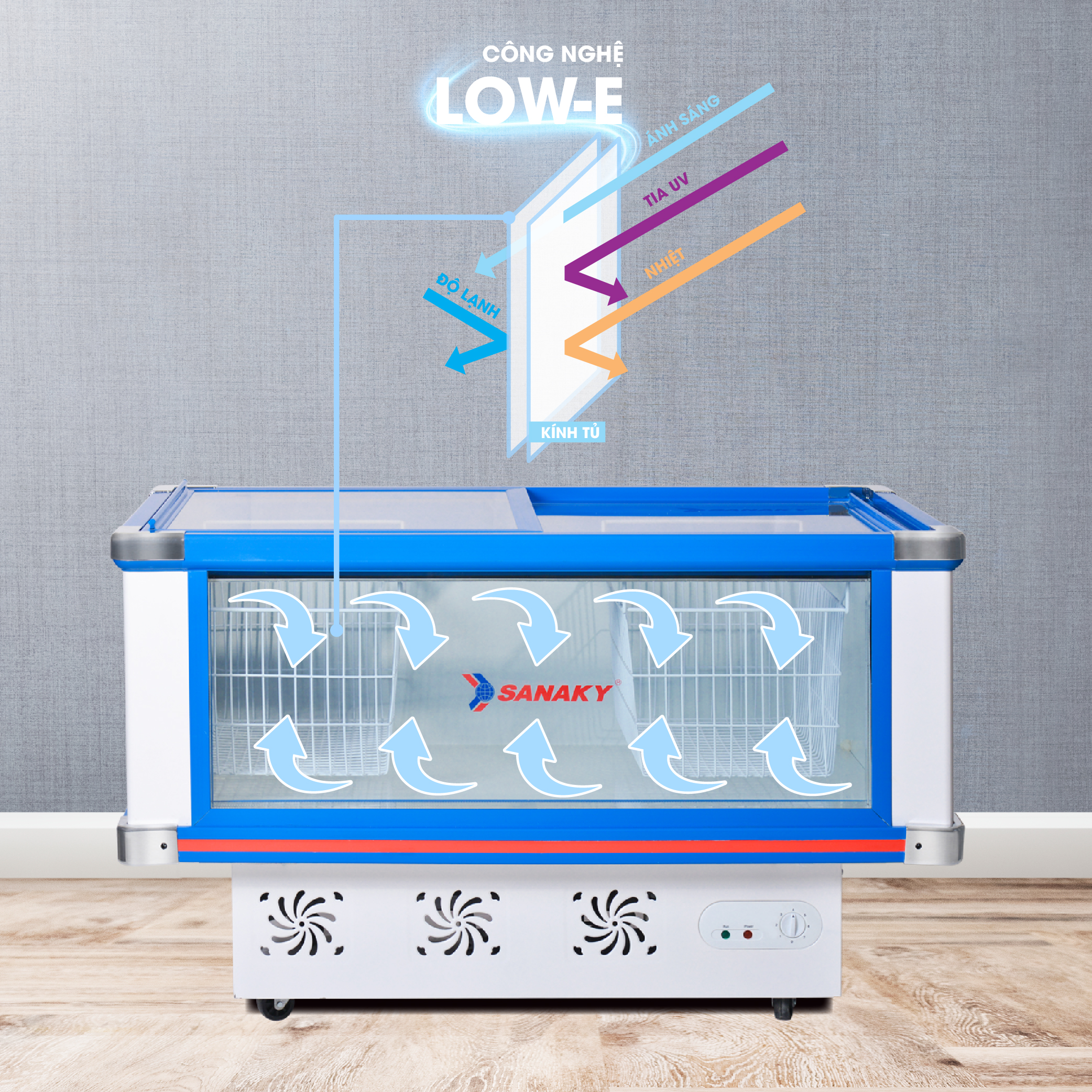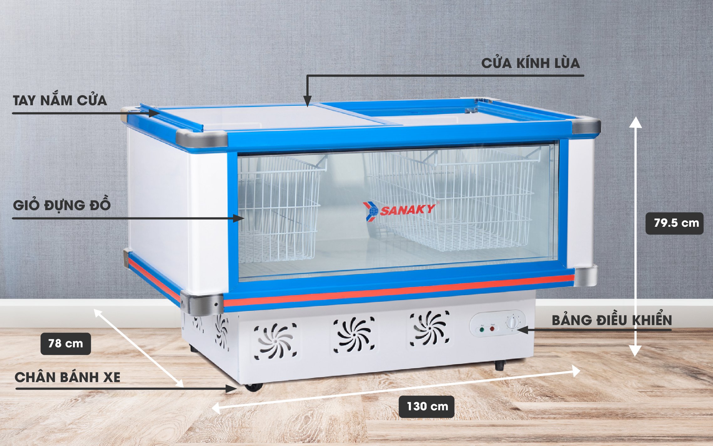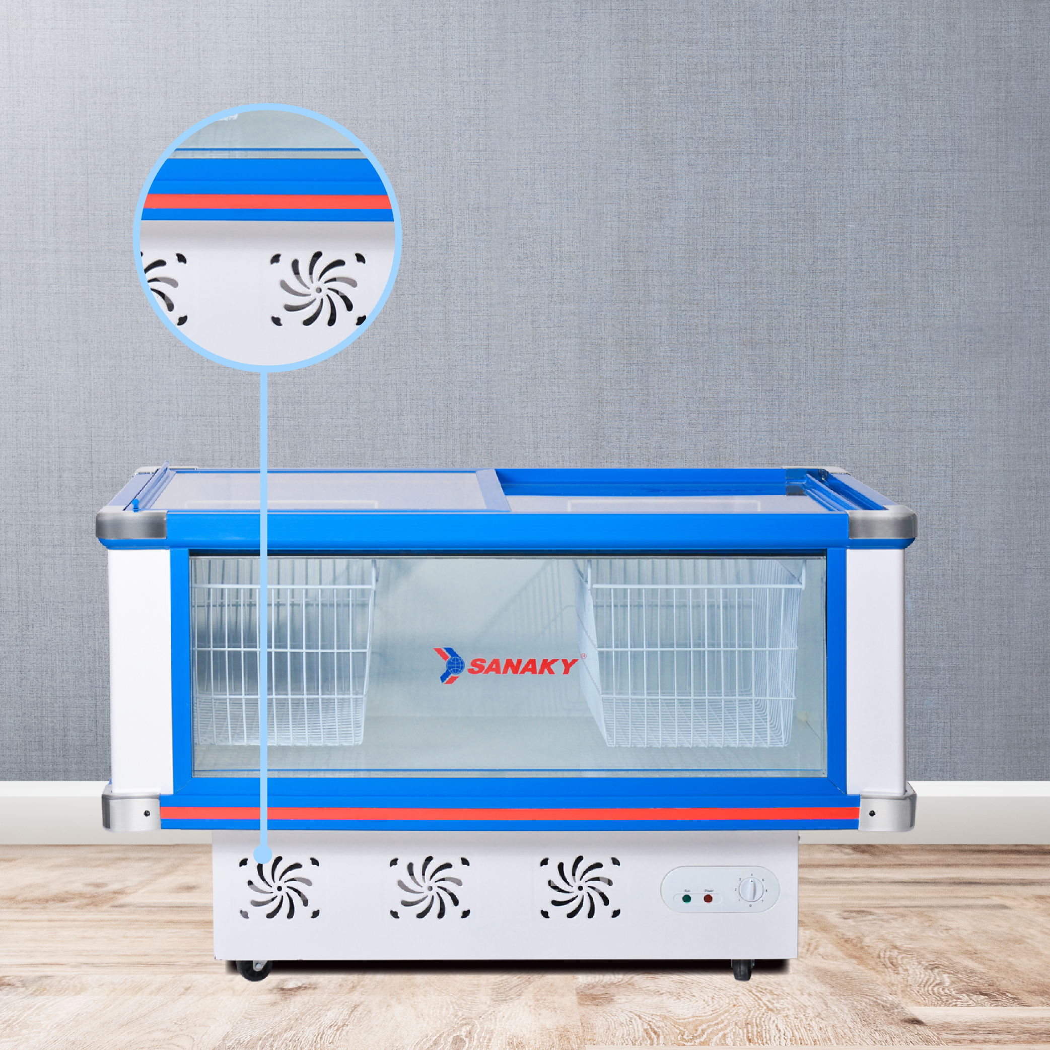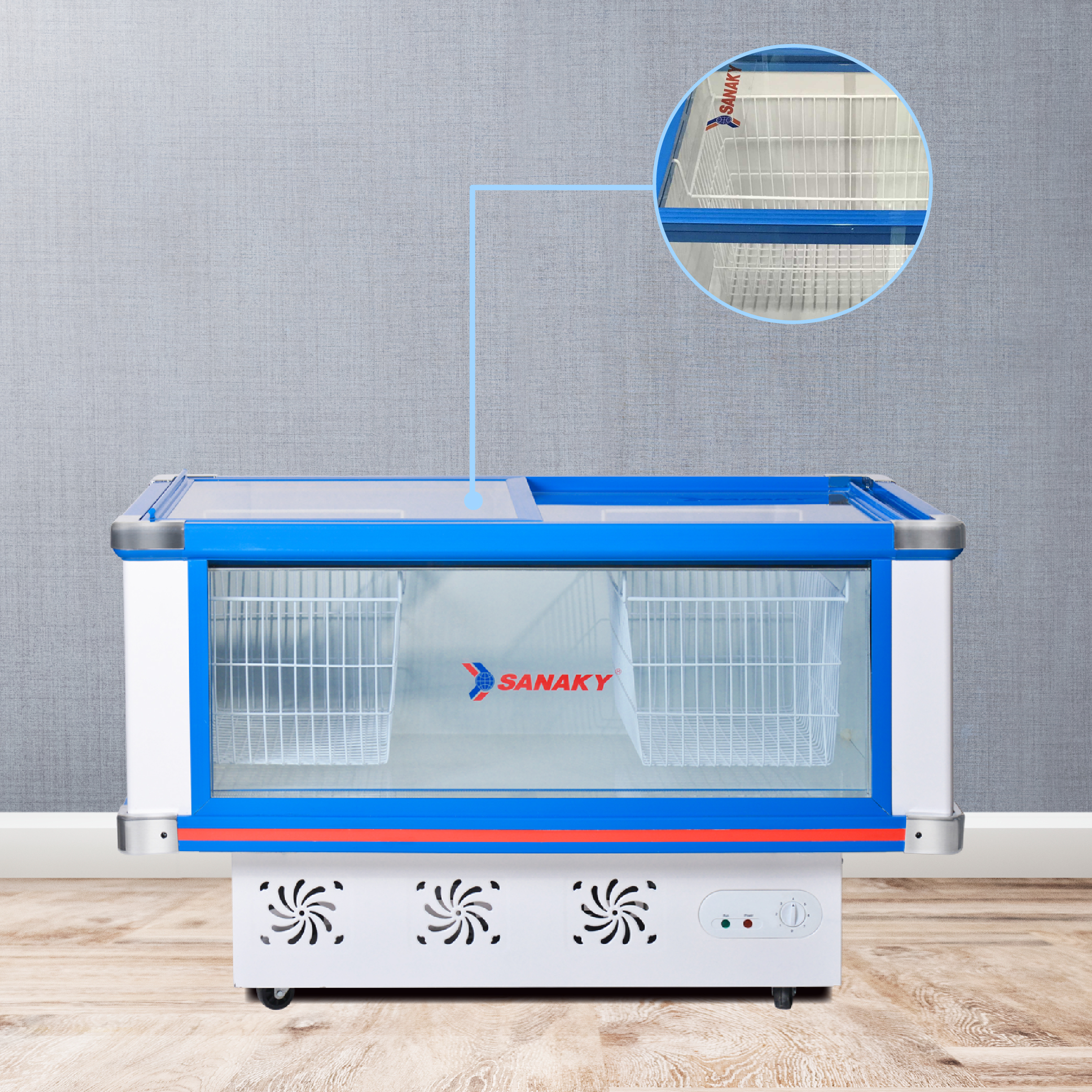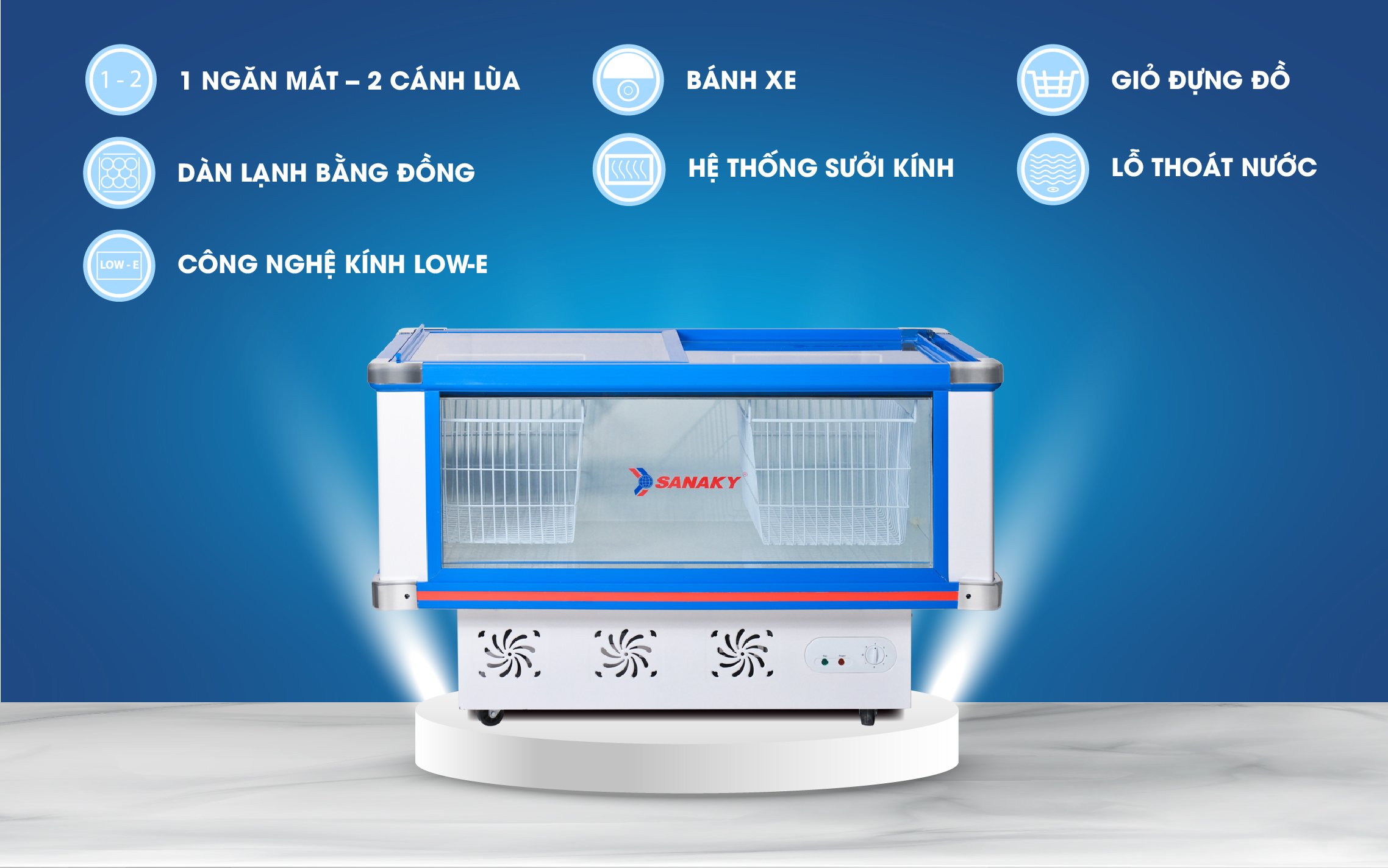 Với thiết kế dáng nằm ngang cùng 2 cánh cửa kính theo dạng kính lùa thì sản phẩm sẽ đáp ứng tốt các nhu cầu bảo quản thực phẩm, đồ uống, cũng như mục đích trưng bày kinh doanh ở cửa hàng, siêu thị với các mặt hàng cần bảo quản mát như rau, củ, quả,..