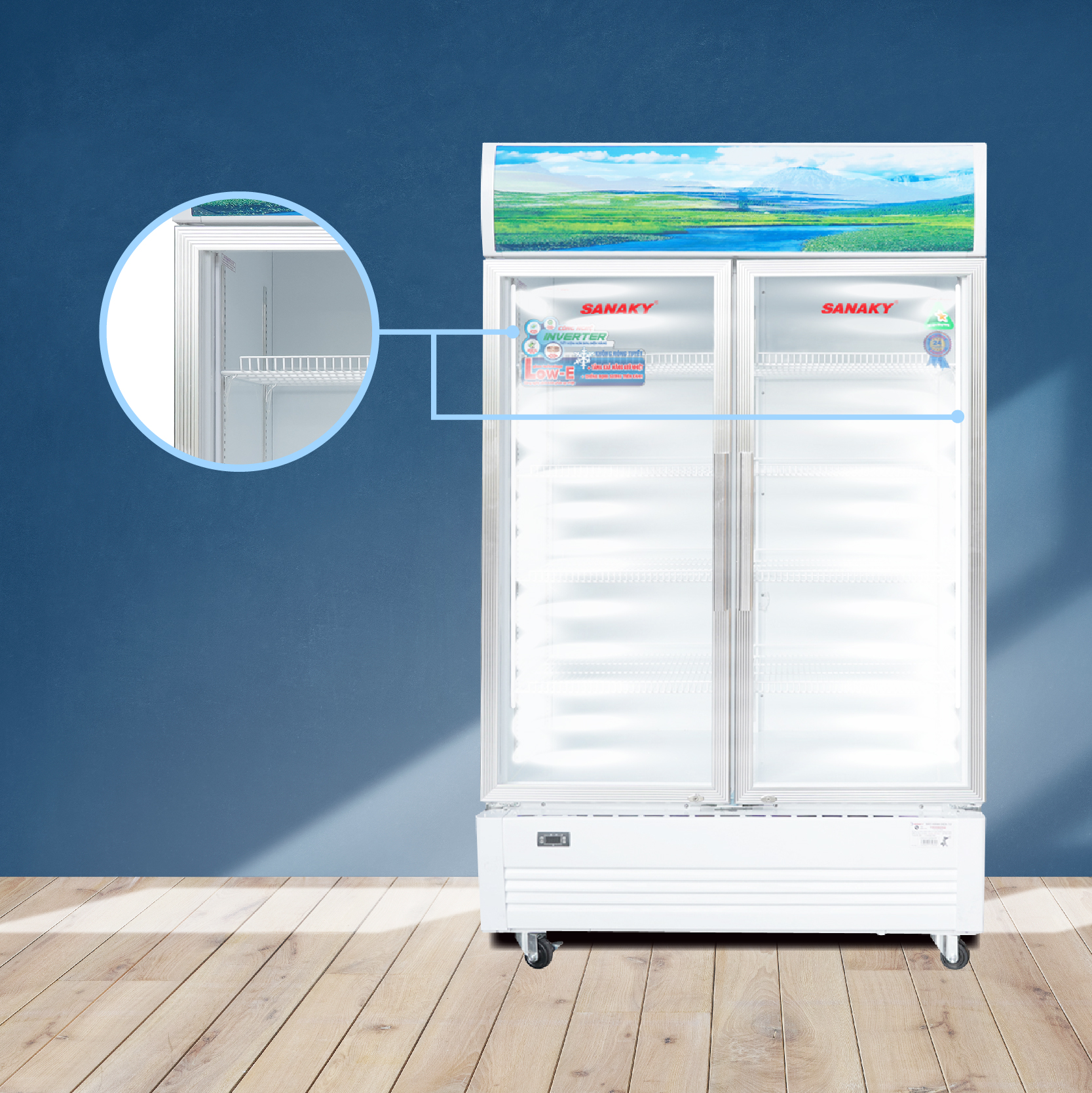 Thiết kế dáng đứng cùng 2 cánh cửa kính thì sản phẩm sẽ đáp ứng tốt các nhu cầu bảo quản thực phẩm, đồ uống, cũng như mục đích trưng bày kinh doanh ở cửa hàng, siêu thị với các mặt hàng cần bảo quản mát như rau, củ, quả, nước giải khát,…