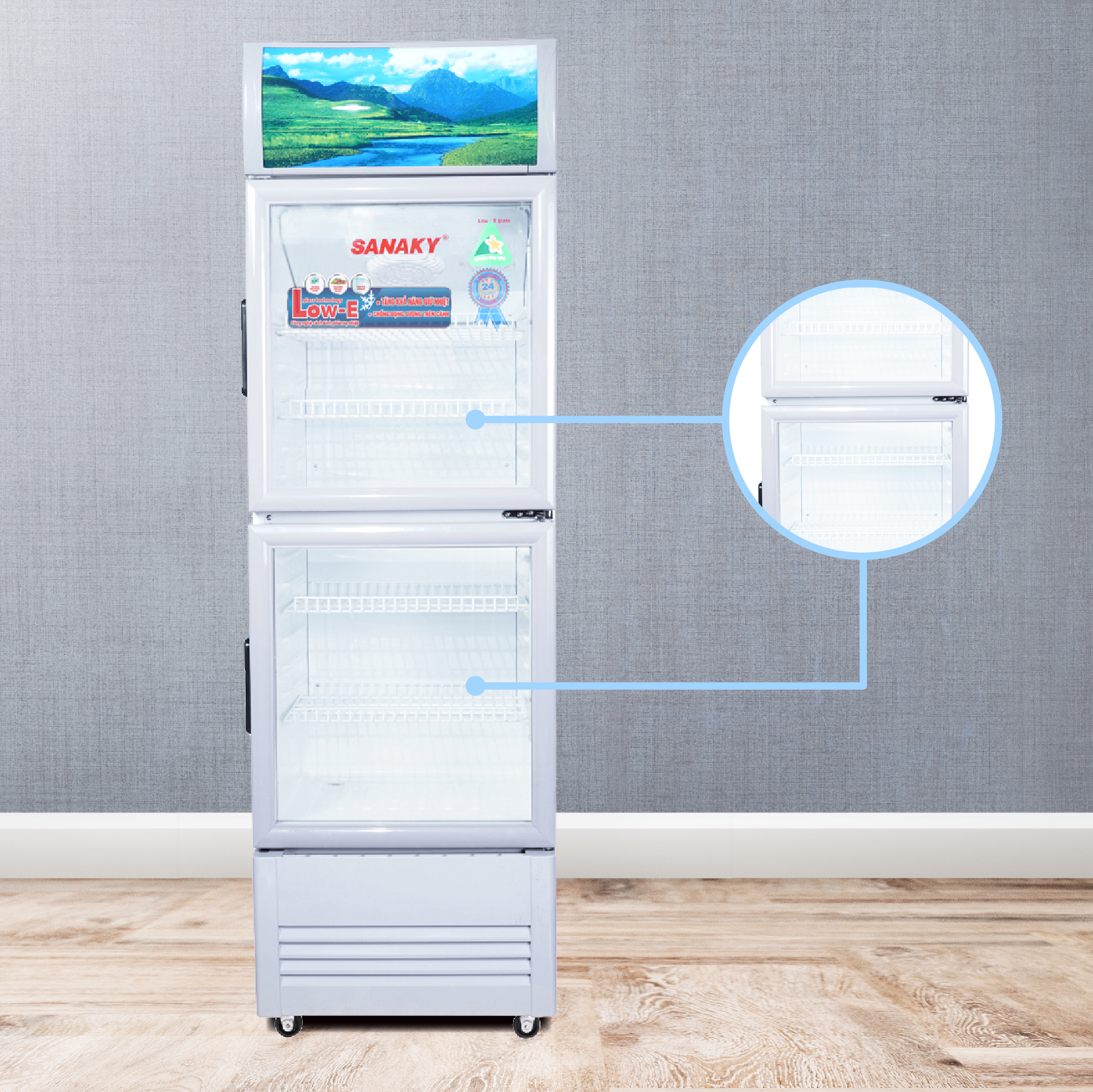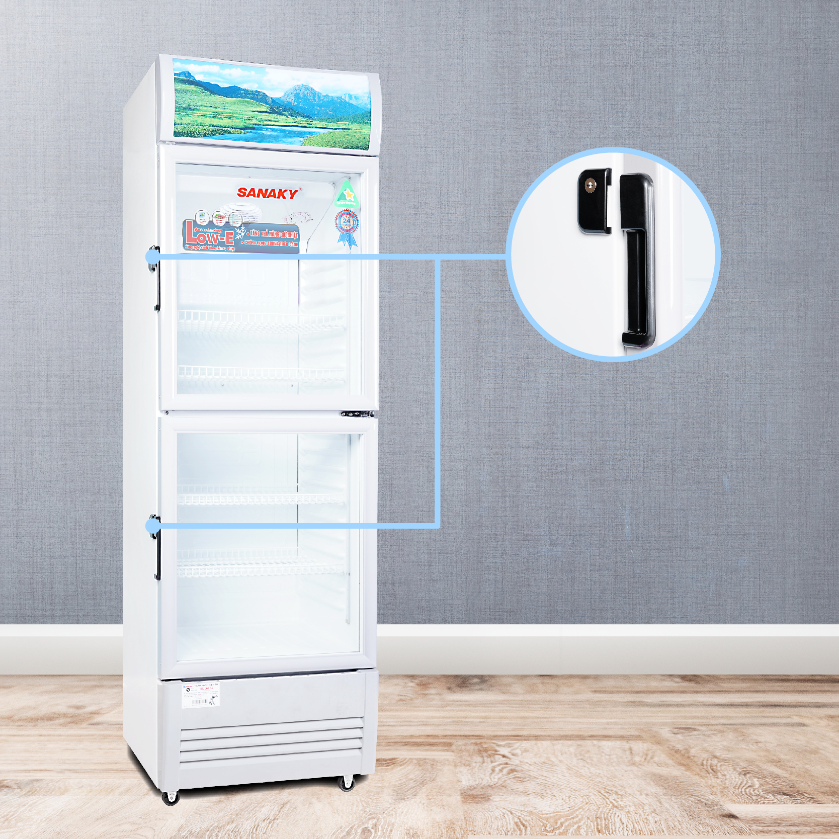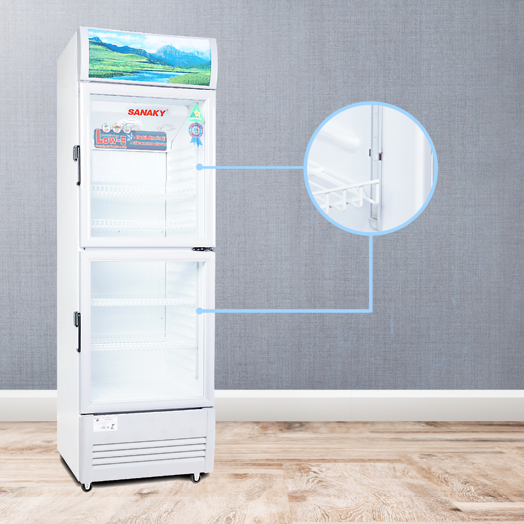 Tủ mát Sanaky được thiết kế với hệ thống đèn LED dọc theo hông và nóc tủ, chiếu sáng toàn bộ các góc khuất giúp trưng bày các sản phẩm bắt mắt và thu hút.